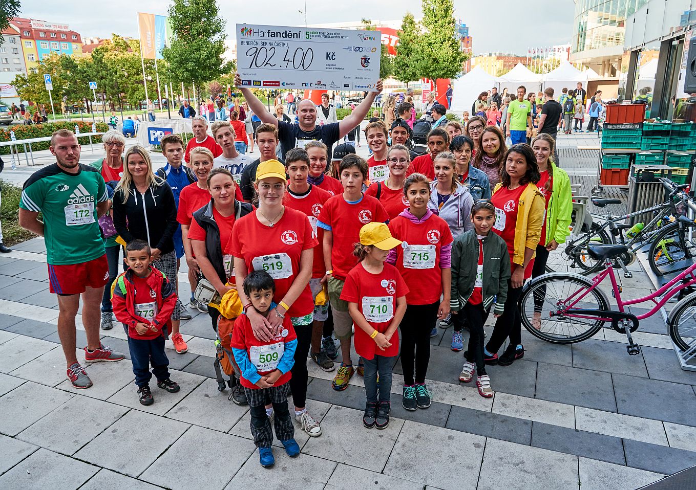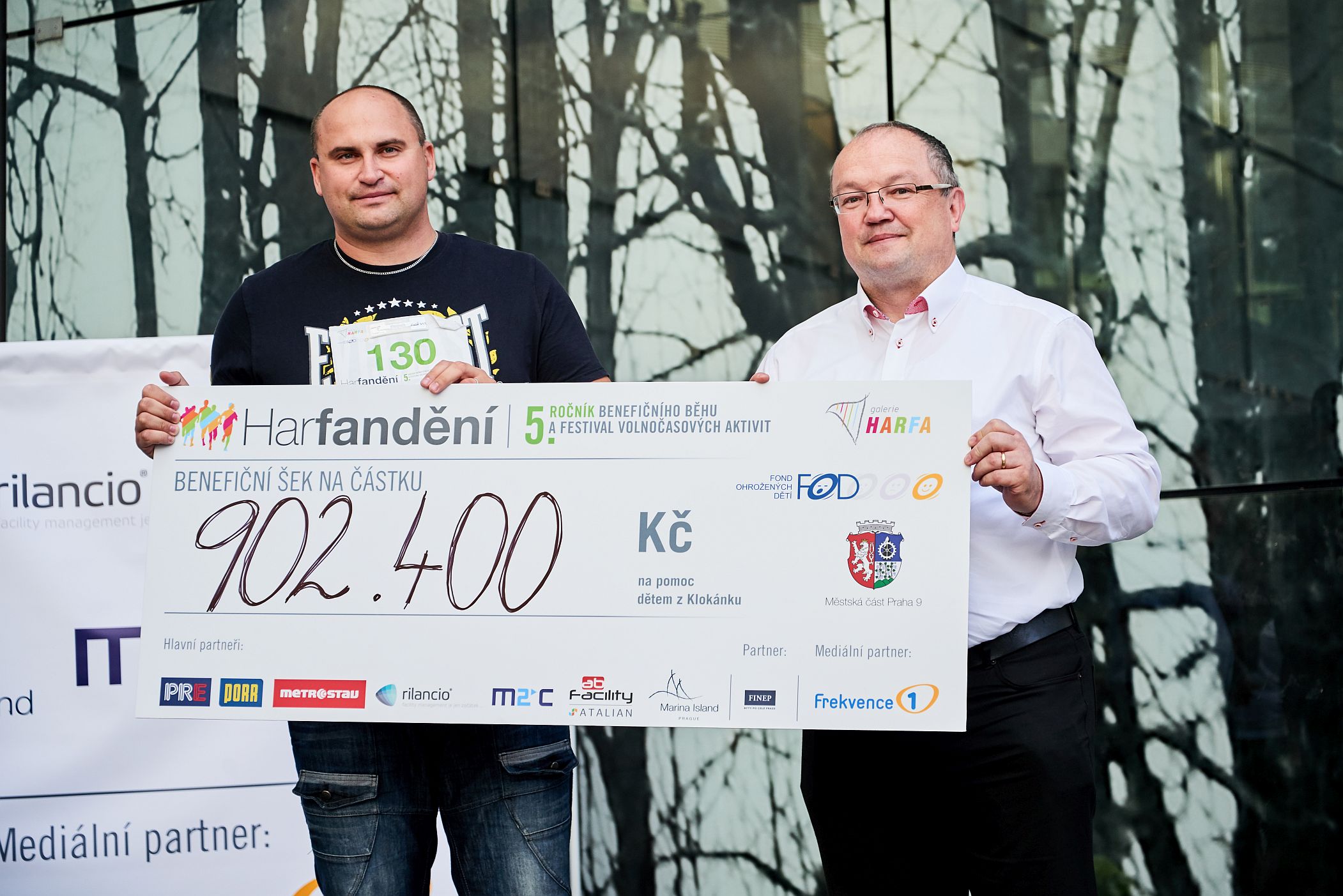 5. ročník Harfandění byl opravdu rekordní, na trati kolem Galerie Harfa a sousední O2 areny bylo po celou dobu konání akce plno běžců. A za každý okruh, který běžci zdolali, poslala Galerie Harfa 100 Kč Fondu ohrožených dětí na projekt Klokánek. Celkem bylo během 4 hodin uběhnuto necelých 11 tisíc kilometrů, což je vzdušnou čarou zhruba tak daleko jako z Prahy na Bali. A pro Klokánky to znamená 902 400 Kč. Symbolický šek na tuto částku předal ihned po ukončení běhu ředitel obchodního centra Pavel Skorčík předsedovi Fondu ohrožených dětí Janu Vaňkovi.